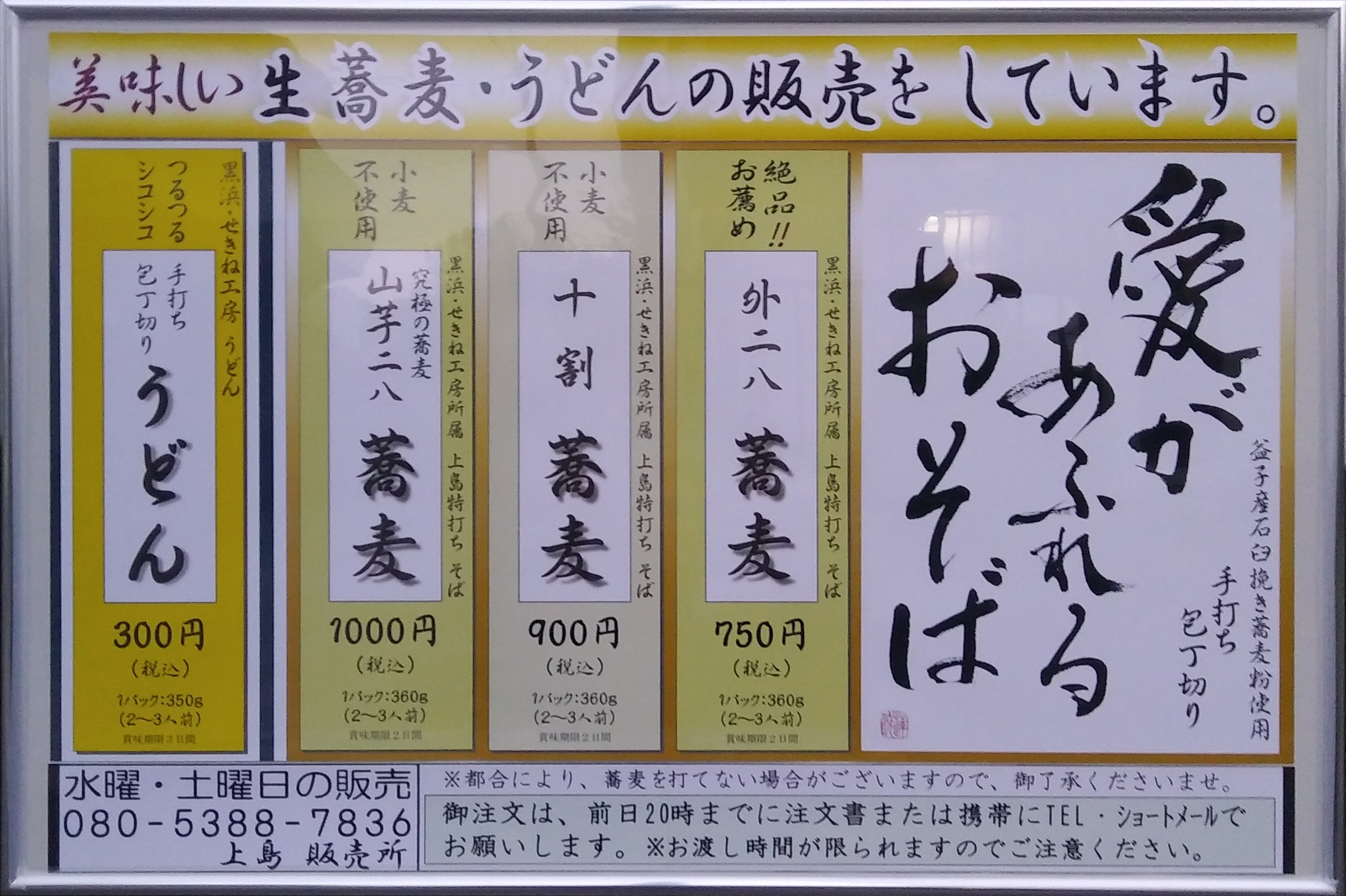 こだわり ・私は毎朝、氣功を行っており、それが、お蕎麦にどれだけ影響あるかわかりませんが、 ある方が、「私が打つお蕎麦や、育てた野菜は、氣功により美味しいはずです。」 とおっしゃってました。 いつも美味しいお蕎麦を味わっていただけるようにと丹精込めて打っております。 ・お蕎麦は、茹でるのもそうですが、まずこねる際の水がかなり大事です。 私のお蕎麦に使う水は、直径約20cm、高さ約40cmの大型の浄水機(株式会社日本シンクマスター様) を通した磁化水を使用しております。 蓮田市の水は美味しいですが、この浄水機を通す事により、清流と同じ様なイオン水となります。 お蕎麦を茹でる際も、大量のいい水で茹でると味が違います。 ・私の生蕎麦は、蕎麦粉の他には小麦粉あるいは山芋しか使わなく、保存料は入ってませんので、 賞味期限を4月中旬~11月中旬は二日間、11月中旬~4月中旬は三日間にしてます。 ・美味しくお蕎麦を召し上がっていただく為に、他の生蕎麦パックに比べると厳重に包装してます。 パックを開けないとお蕎麦は見れませんが、こうすることにより、新鮮さを保てます。 ・ まず、パックを明けた時に、お蕎麦が美味しいそうに見え、感動していただき、 茹でて食べる時にも美味しそうに見え、そして食して感動していただけるように心がけております。 ・私のお蕎麦は、「細いけれど、風味がかなり感じられ、コシが有り、喉越しが良いお蕎麦」 を念頭に打っております。 【麺つゆについて】 通常のお蕎麦屋さんのつゆの元となる「かえし」には、醤油とみりんに砂糖がいっぱい入ってます。 正直、体には良くありません! そこで、試行錯誤の上、美味しい醤油と極上の本みりんを使用し、砂糖を一切使わない、 安心安全な美味しい「かえし」を作り、そこに出し汁を加えつゆを作っております。 ・醤油は、埼玉県坂戸市の弓削田醤油様の「丸大豆醤油」を使わせて頂いております。 . ・みりんは、愛知県碧南市の角谷文治郎商店様の「三州三河みりん」を使わせて頂いております。 1人前125ml・150円(1パック分・250ml300円)でお分けいたします。 ※ 二日以上前に御注文にて 但し、出し汁の作り置きが出来ませんので、ご用意出来ない場合がございます。ご了承くださいませ。 |